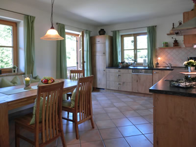 Voll eingerichtete Küche (4-Zonen Kochfeld, Backofen, Dunstabzug, Geschirrspülmaschine, Kühl-Gefrierkombination, Kaffeemaschine, Wasserkocher, Toaster, Eierkocher, Handmixer, reichlich Geschirr, Radio, Sitzgruppe). |
