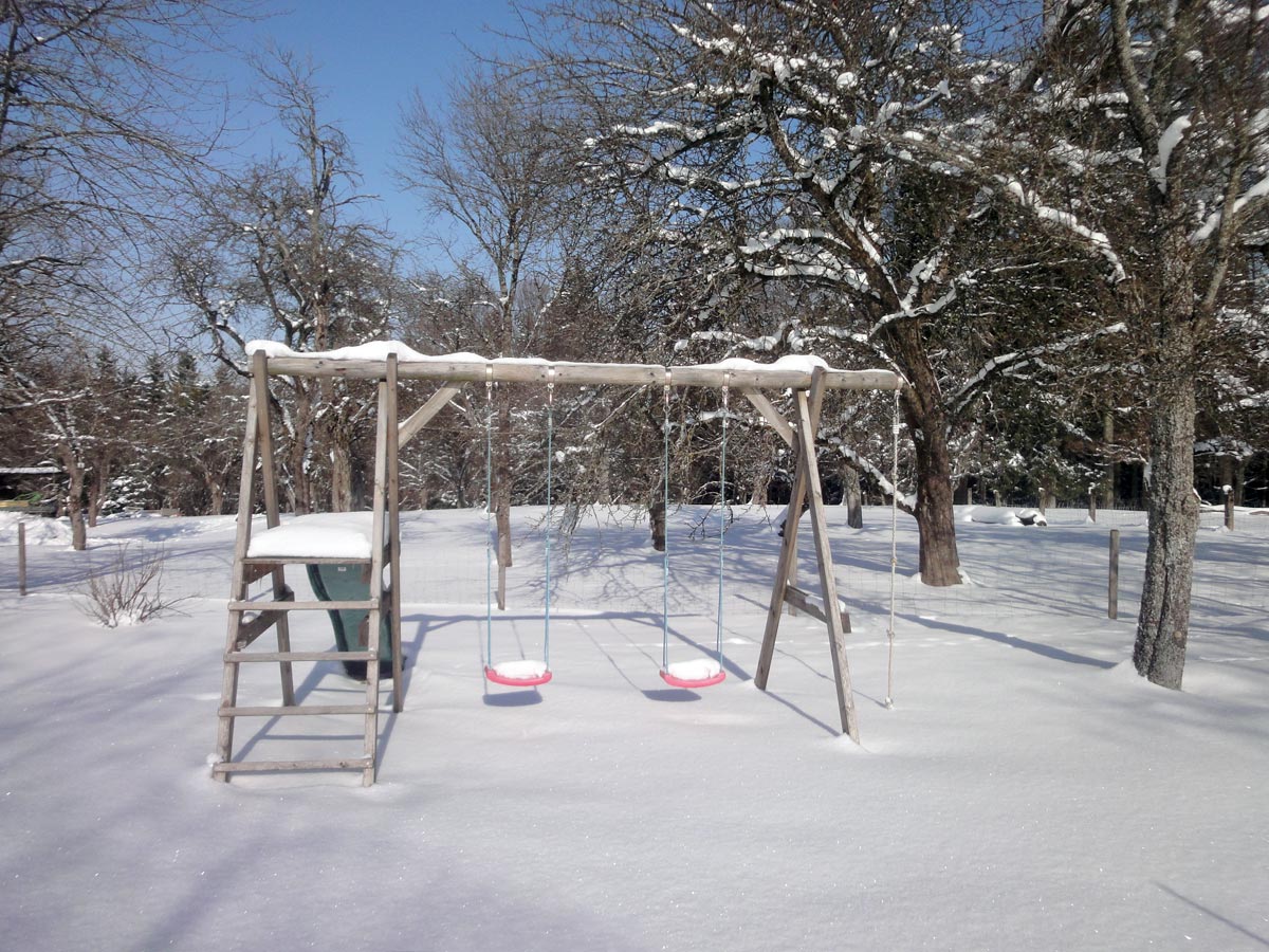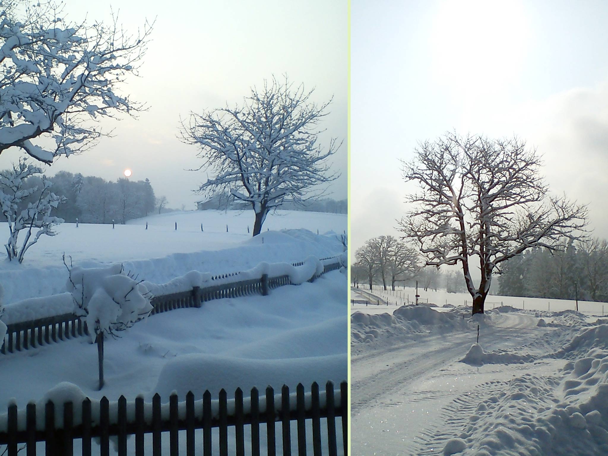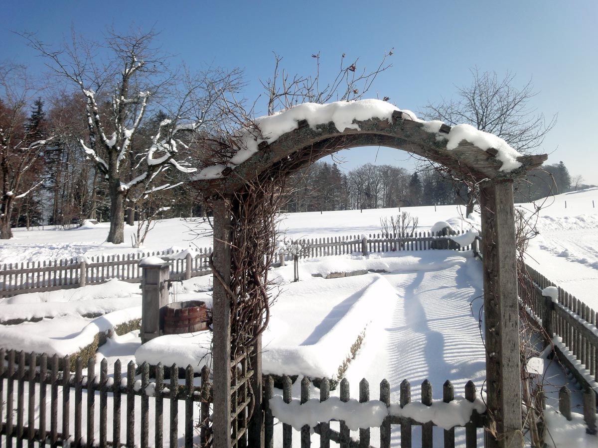 Bauerngarten vor dem Haus im winterlichen Kleid